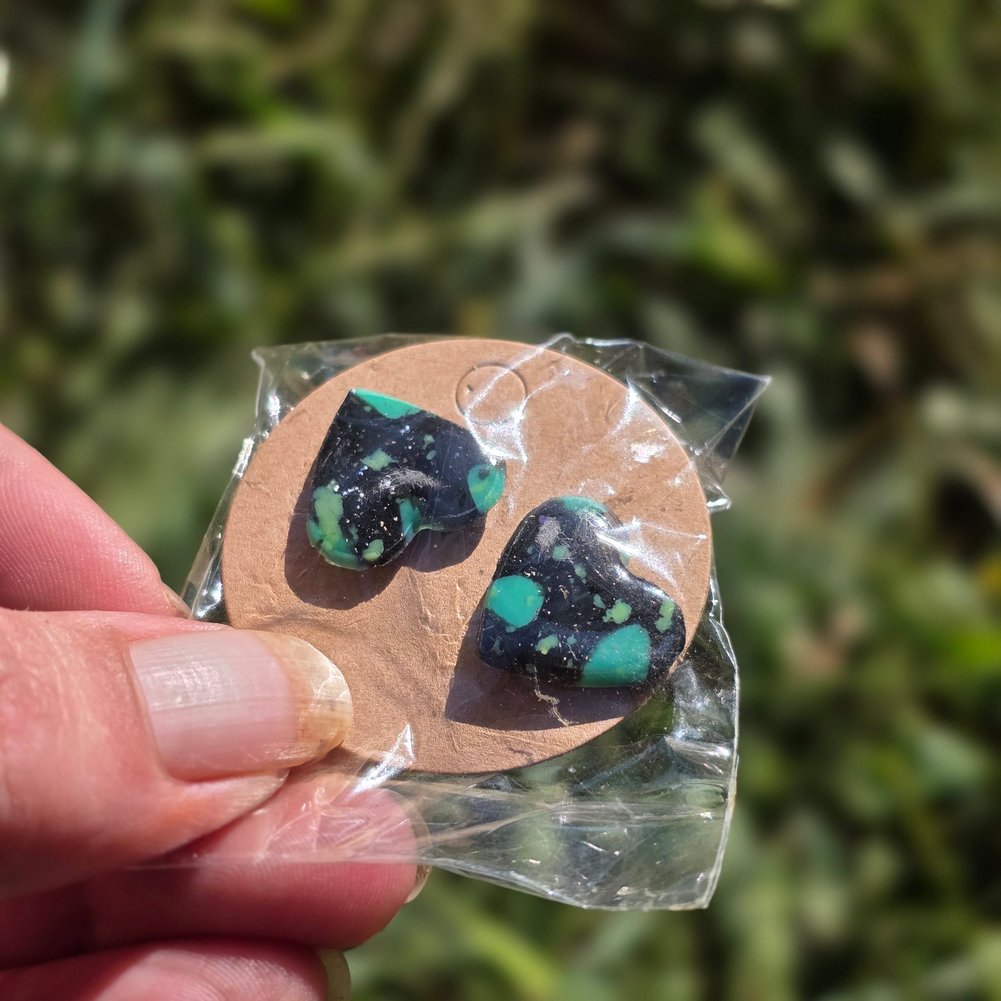Polymer clay, steel peg, handcrafted earrings, glow in the dark. Uv resin top coat.