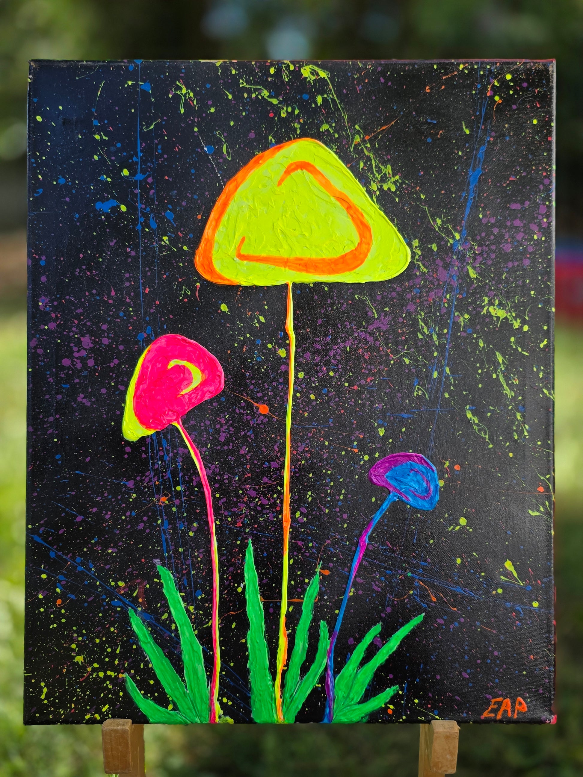 Canvas on wood frame. UV reactive. Many layers. Texture paint, acrylic paint, neon, polyurethane top coat.