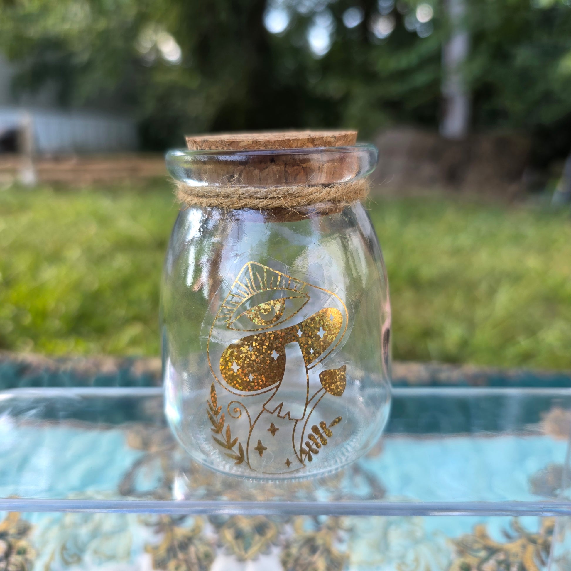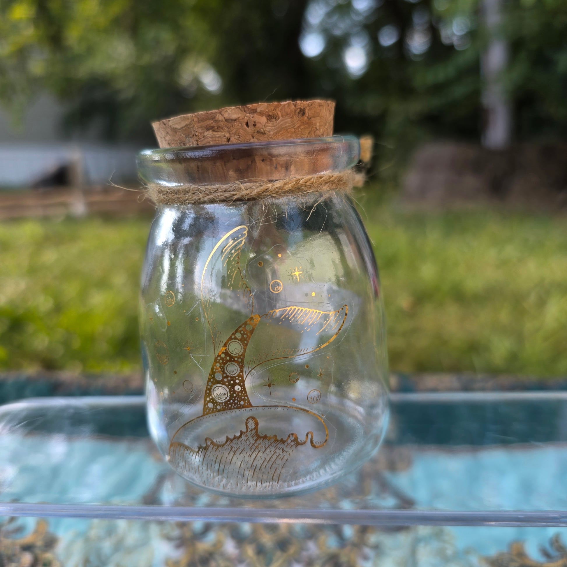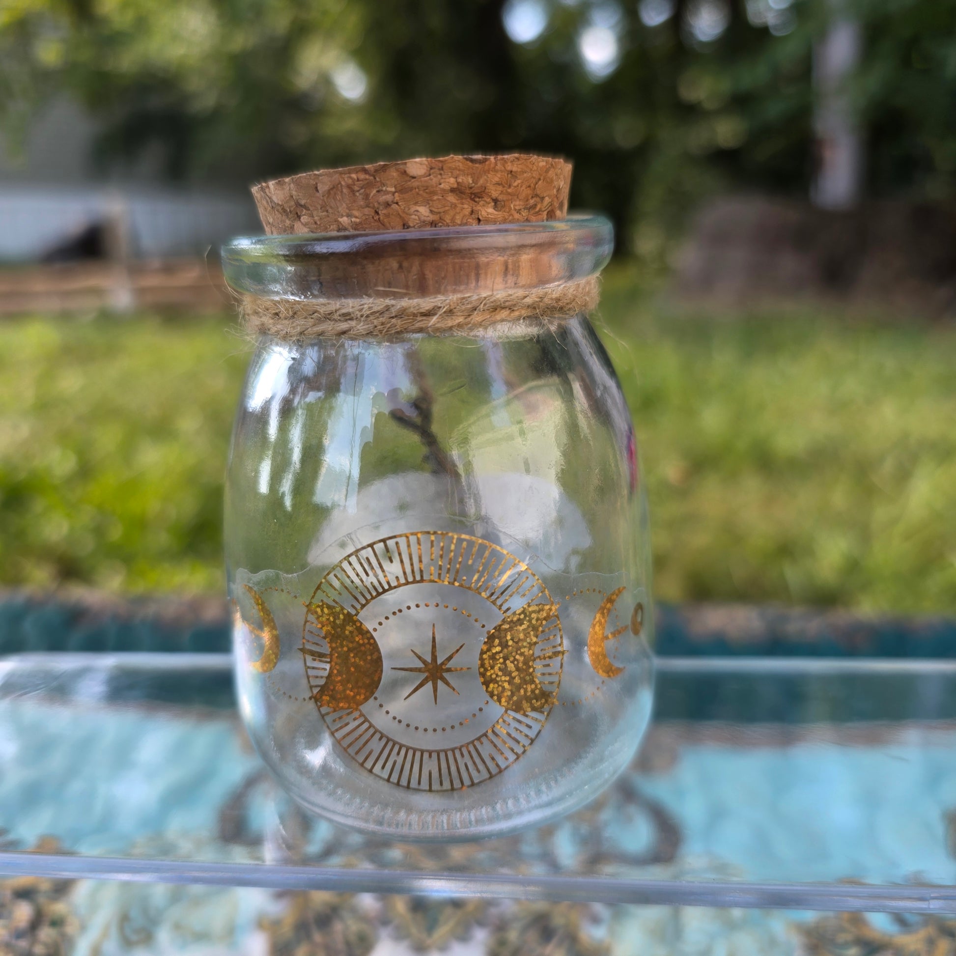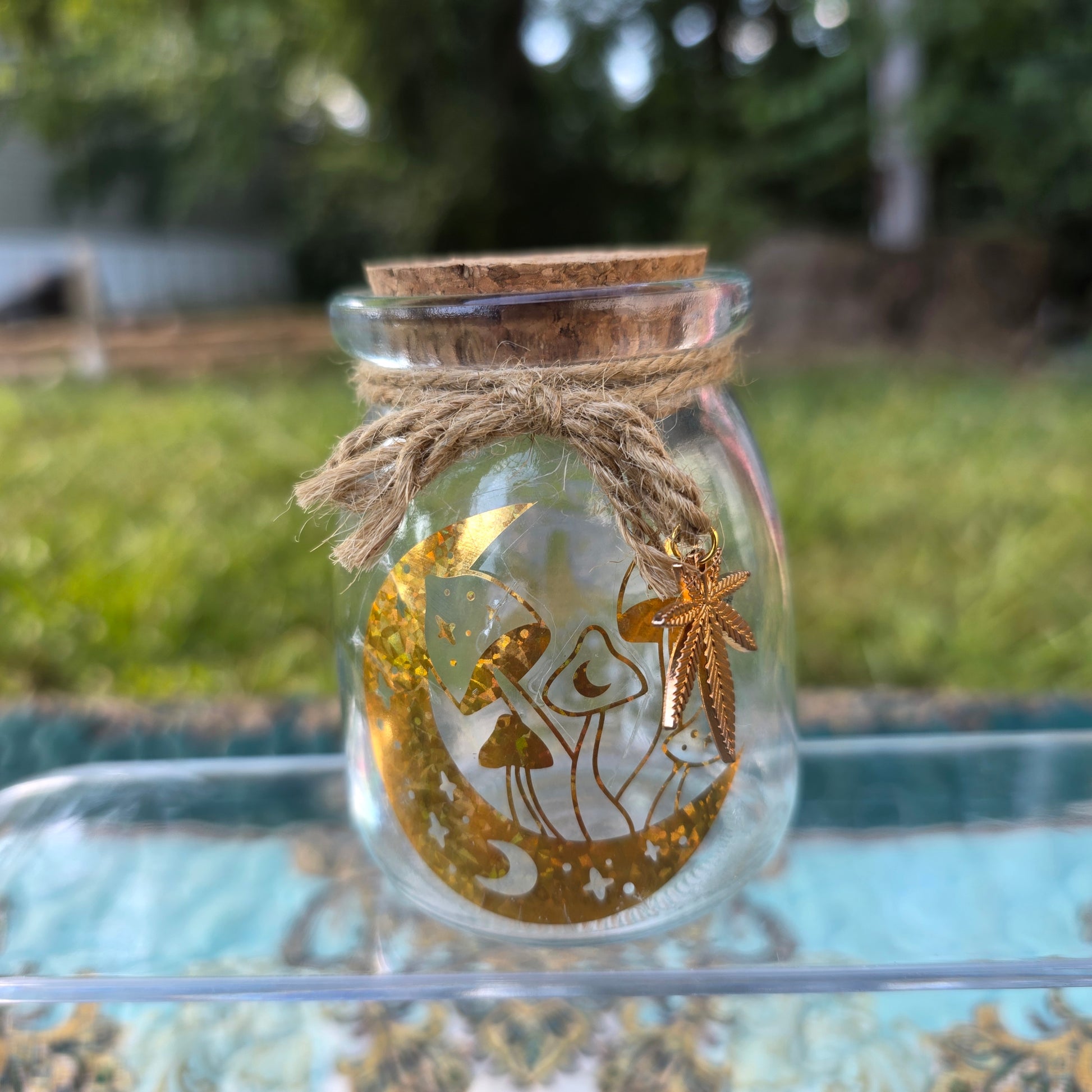 Glass & cork rubber. Approx 3 oz jar. Front and back art. Metal charm. You can put your tweed in there...