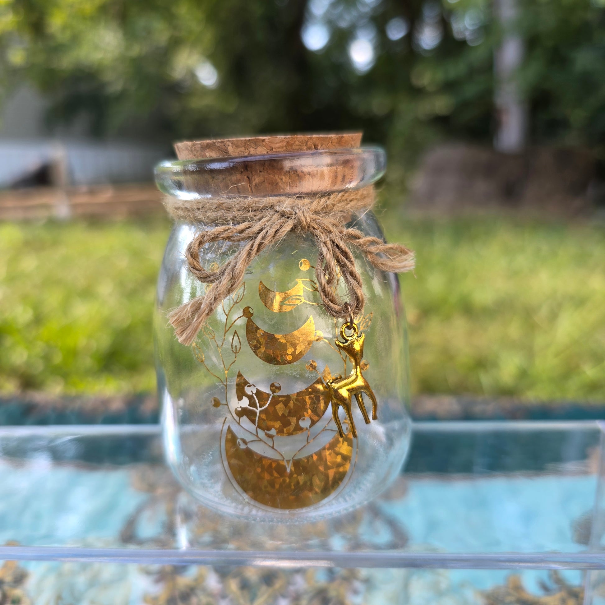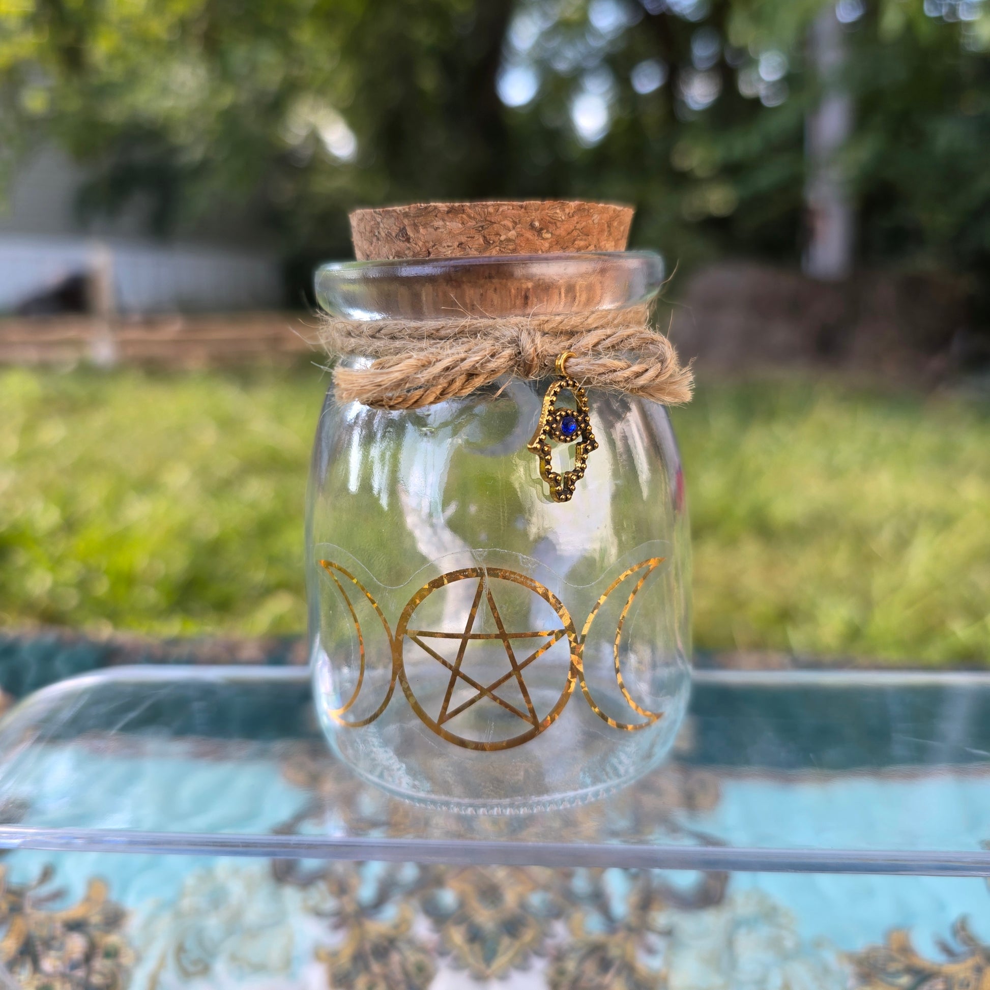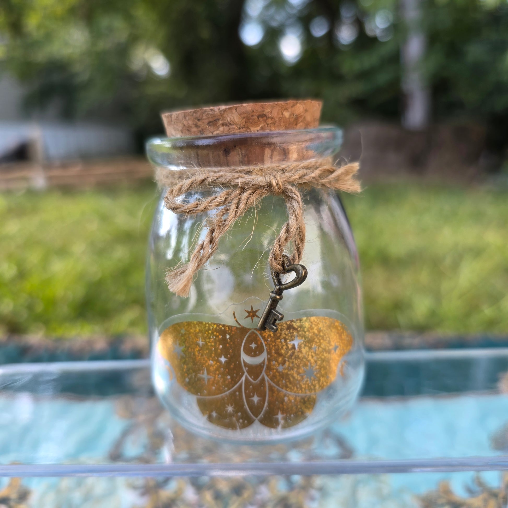Glass & cork rubber. Approx 3 oz jar. Front and back art. Metal charm. You can put your tweed in there...