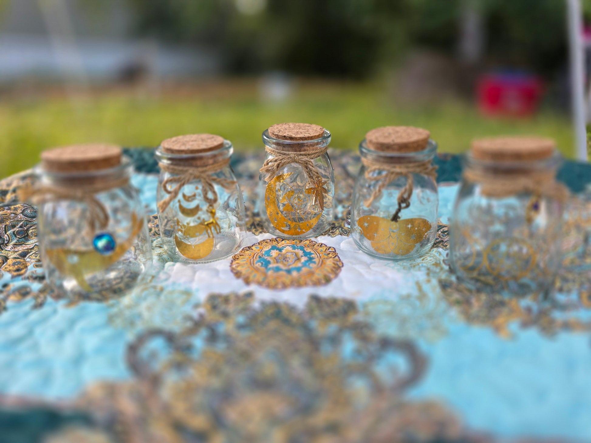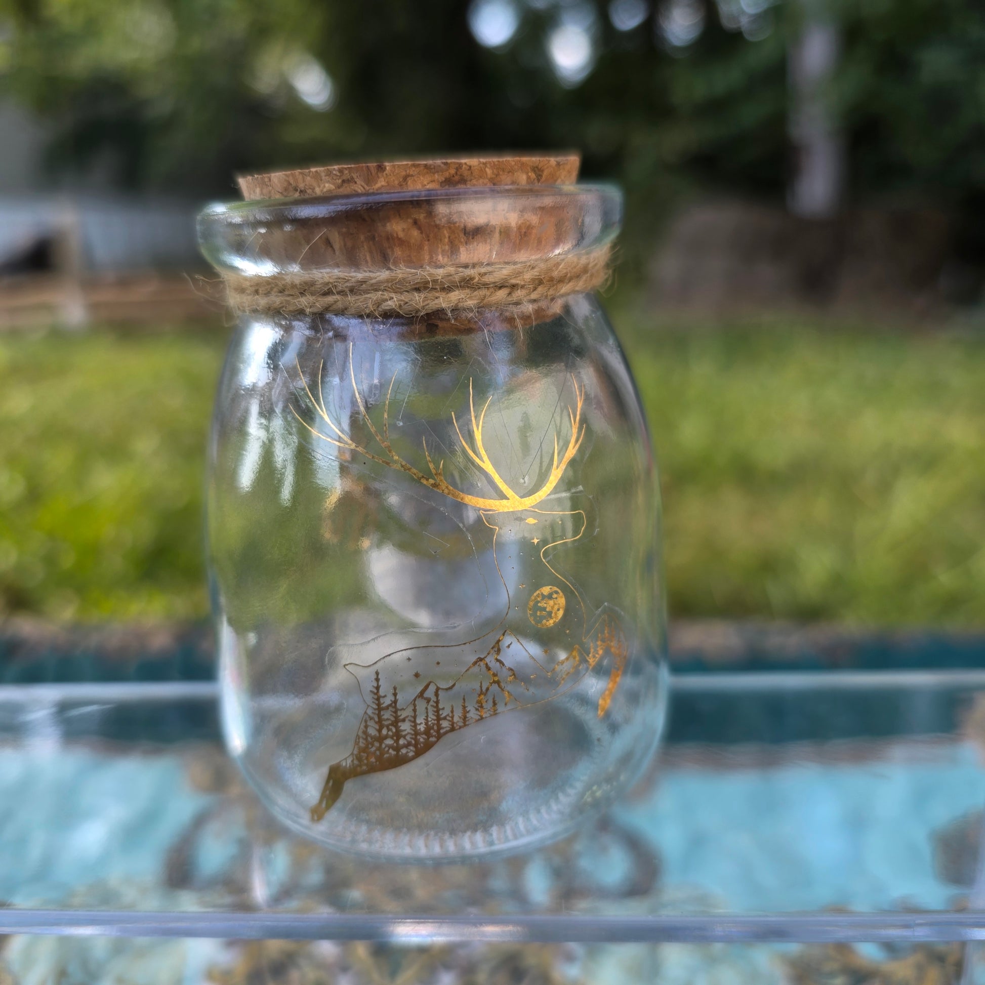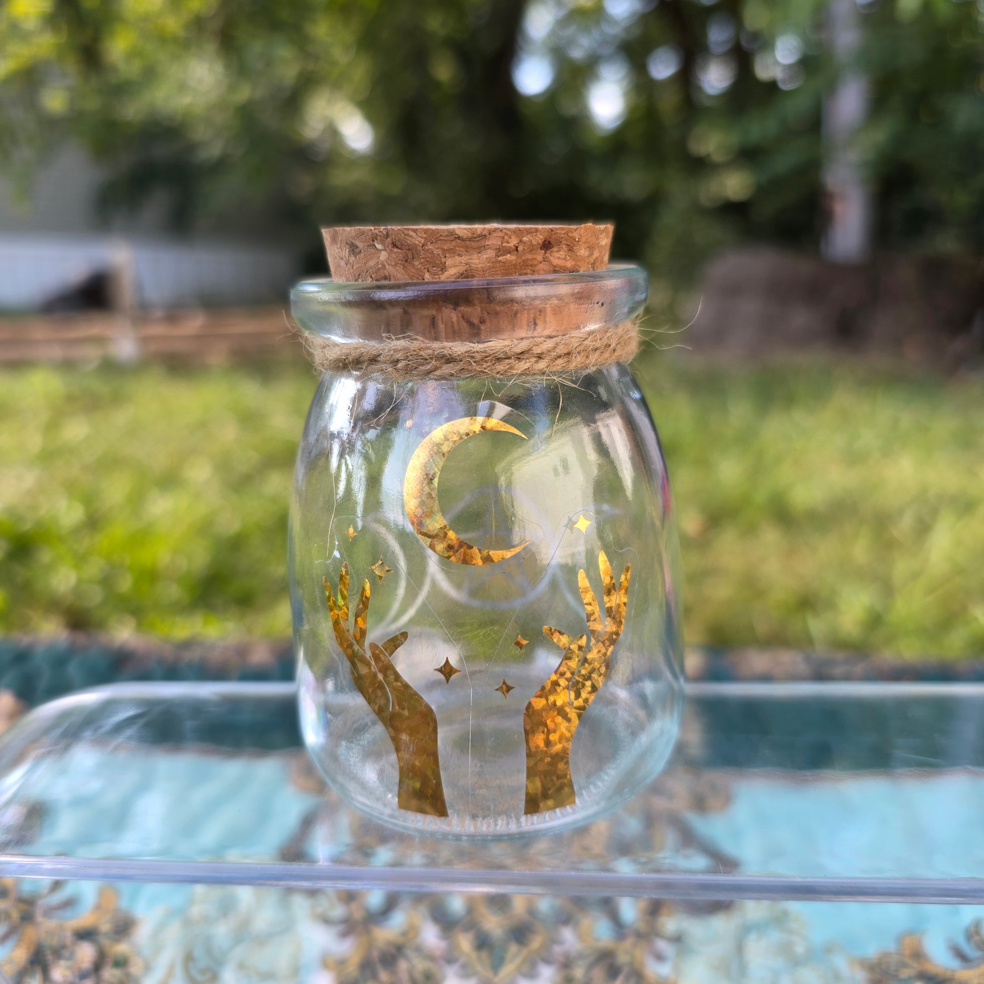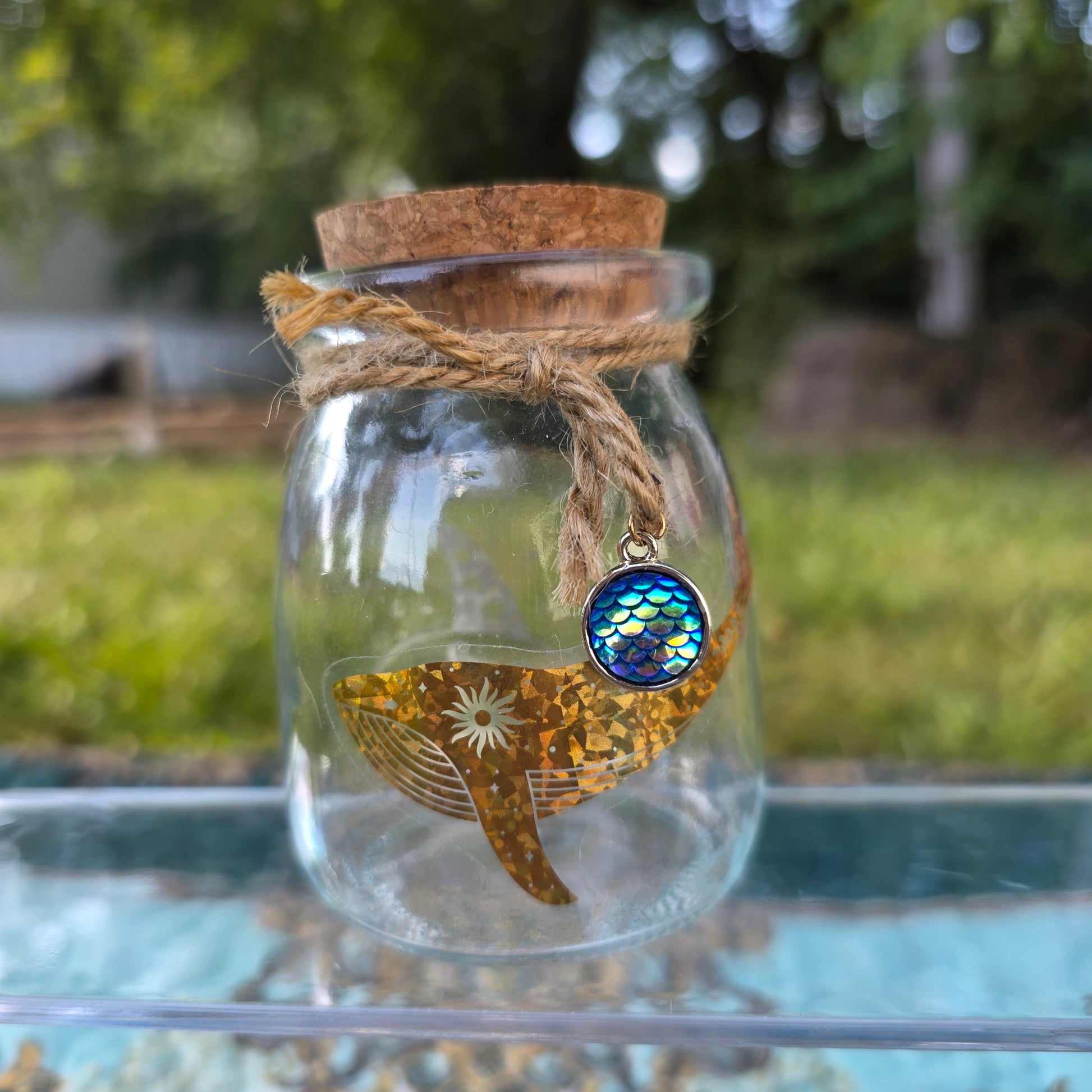 Glass & cork rubber. Approx 3 oz jar. Front and back art. Metal charm. You can put your tweed in there...