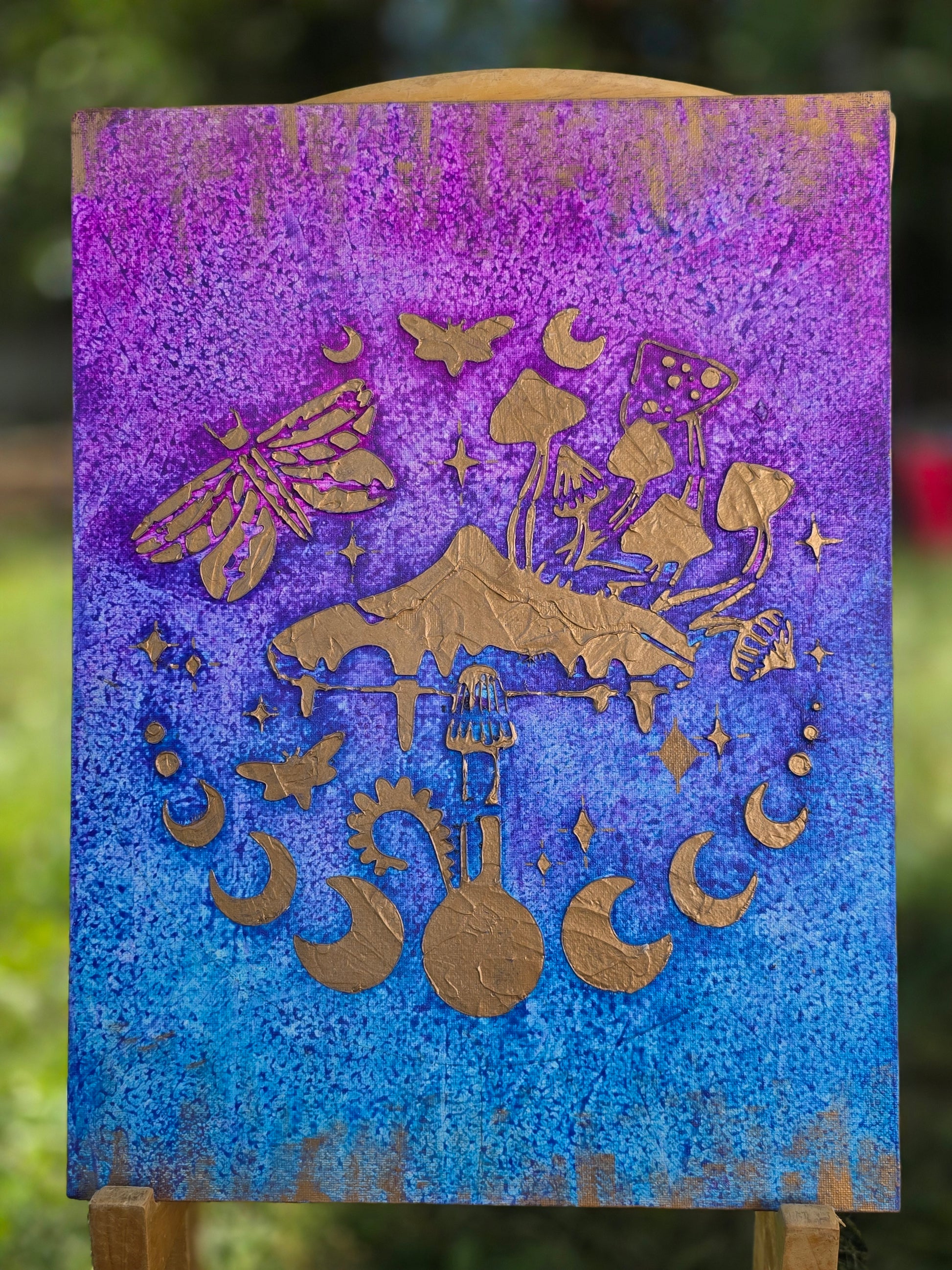 Texture paint, acrylic paint, real gold paint, thin pressed cardboard canvas.