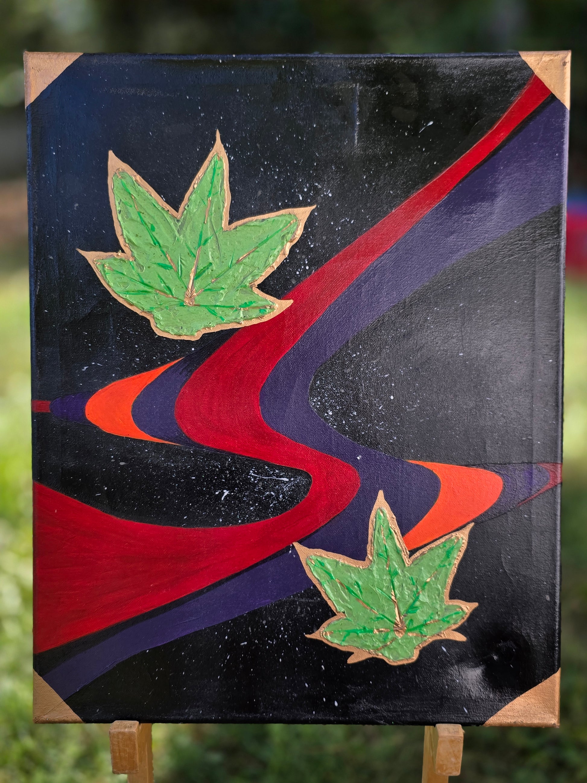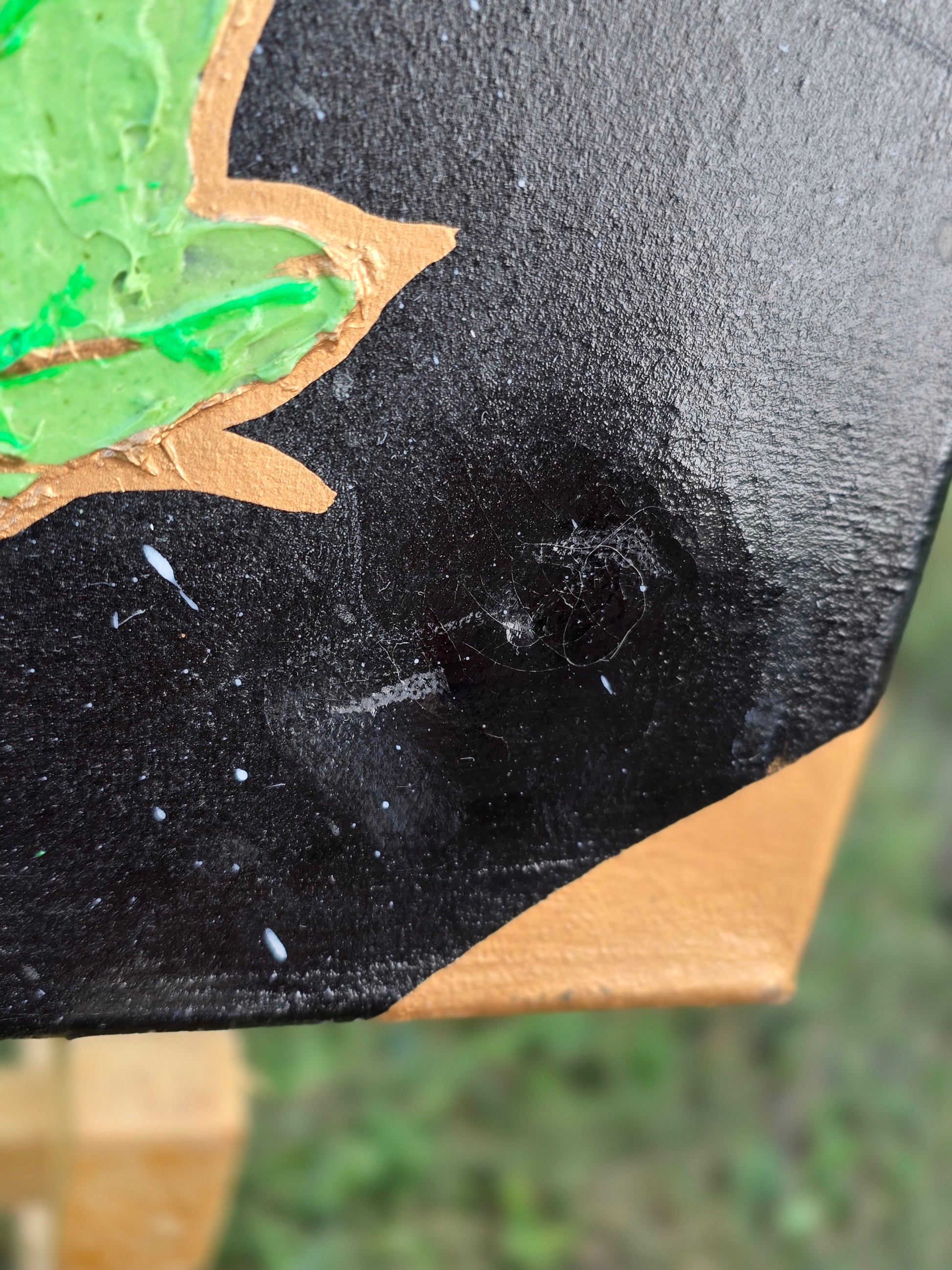Acrylic paint, polyurethane top coat, alcohol ink marker, real gold paint, glow, UV reactive. Canvas on wood frame. Slight dent in lower right corner (2nd photo). Took many moons!